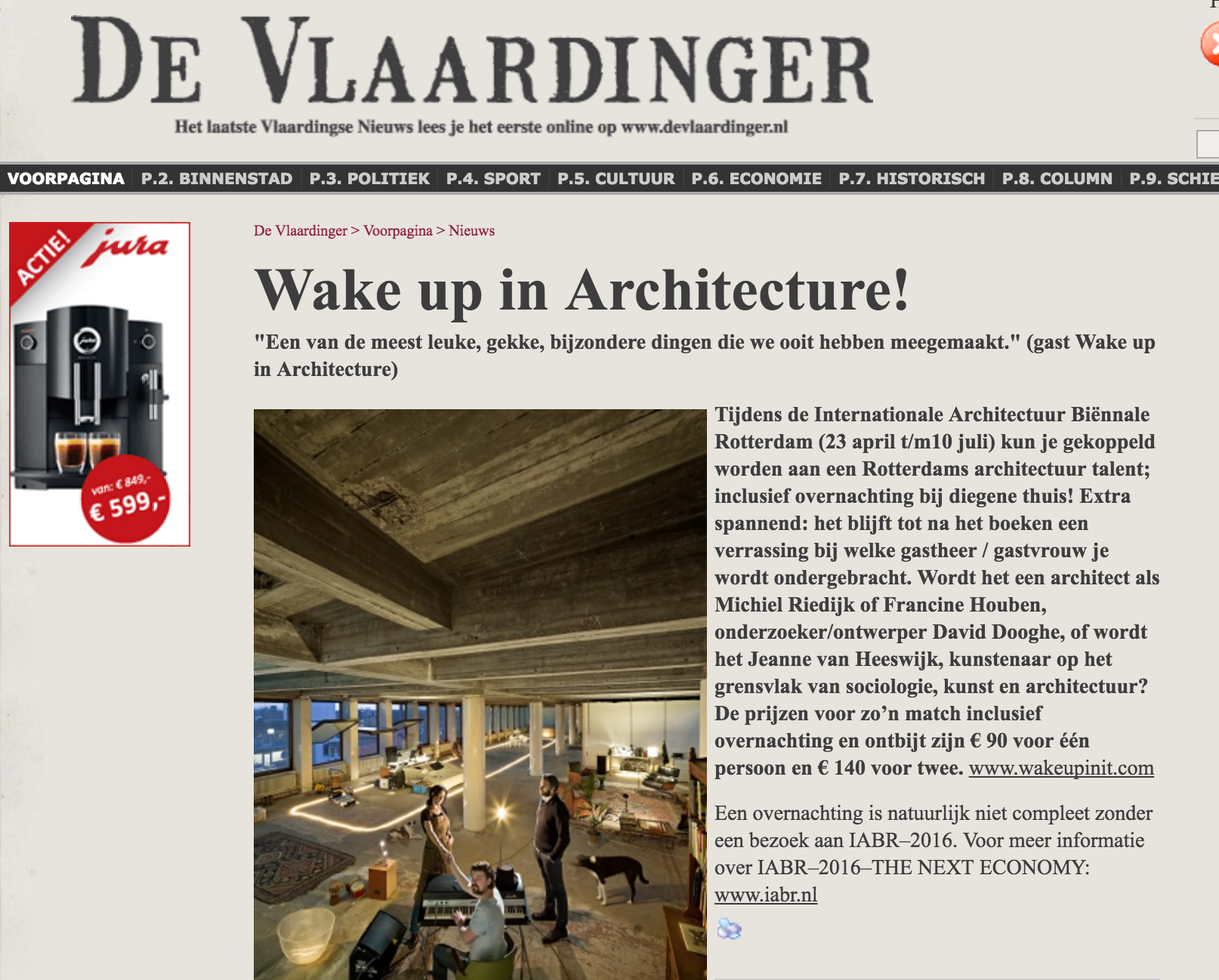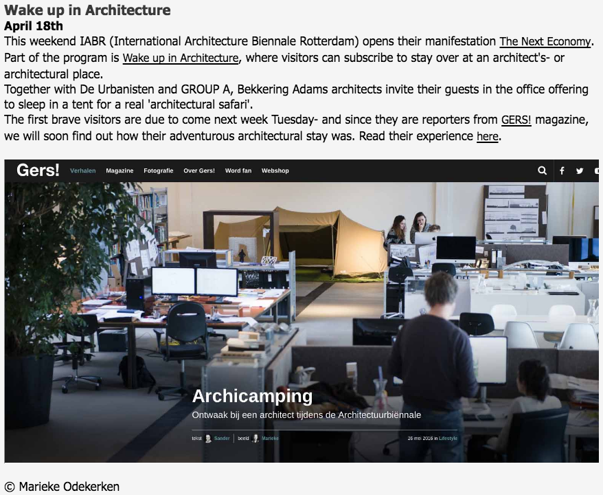 Wat een Meet & Greet bij een popconcert is of een bezoek aan de cockpit bij een vliegreis, dat is het evenement ‘Wake up in Architecture’ voor de deelnemers aan de Internationale Architectuurbiennale Rotterdam, die vandaag is begonnen. Een kijkje nemen in de wereld van de Rotterdamse architectuur door erin te overnachten, dat wil zeggen in het eigen huis van een architect. Onder hen bekende namen als Francine Houben en Michiel Rijdijk.